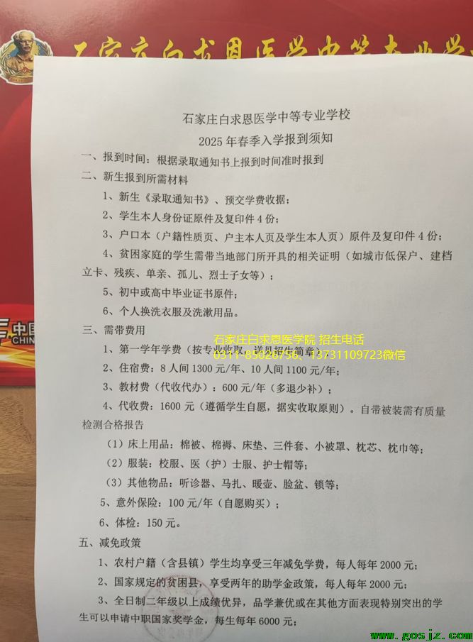 石家庄白求恩医学中等专业学校2025年春季新生入学须知