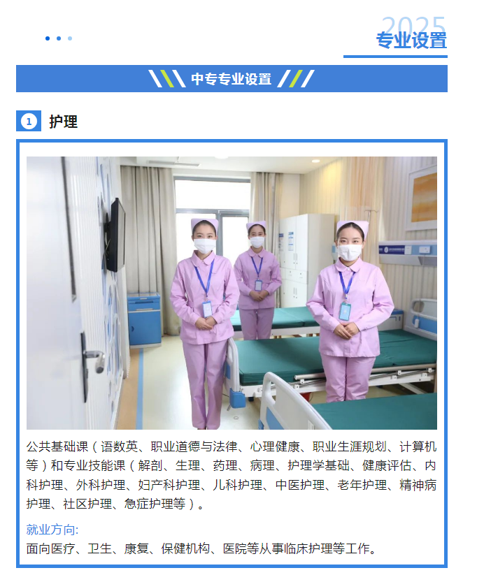 1、普通中专(3年):学习期满,成绩合格,颁发国家承认学历的普通中专毕业证,教育厅学历认证中心可查询。持毕业证可以参加相关执业证书考试,第三年由学校推荐实习就业。